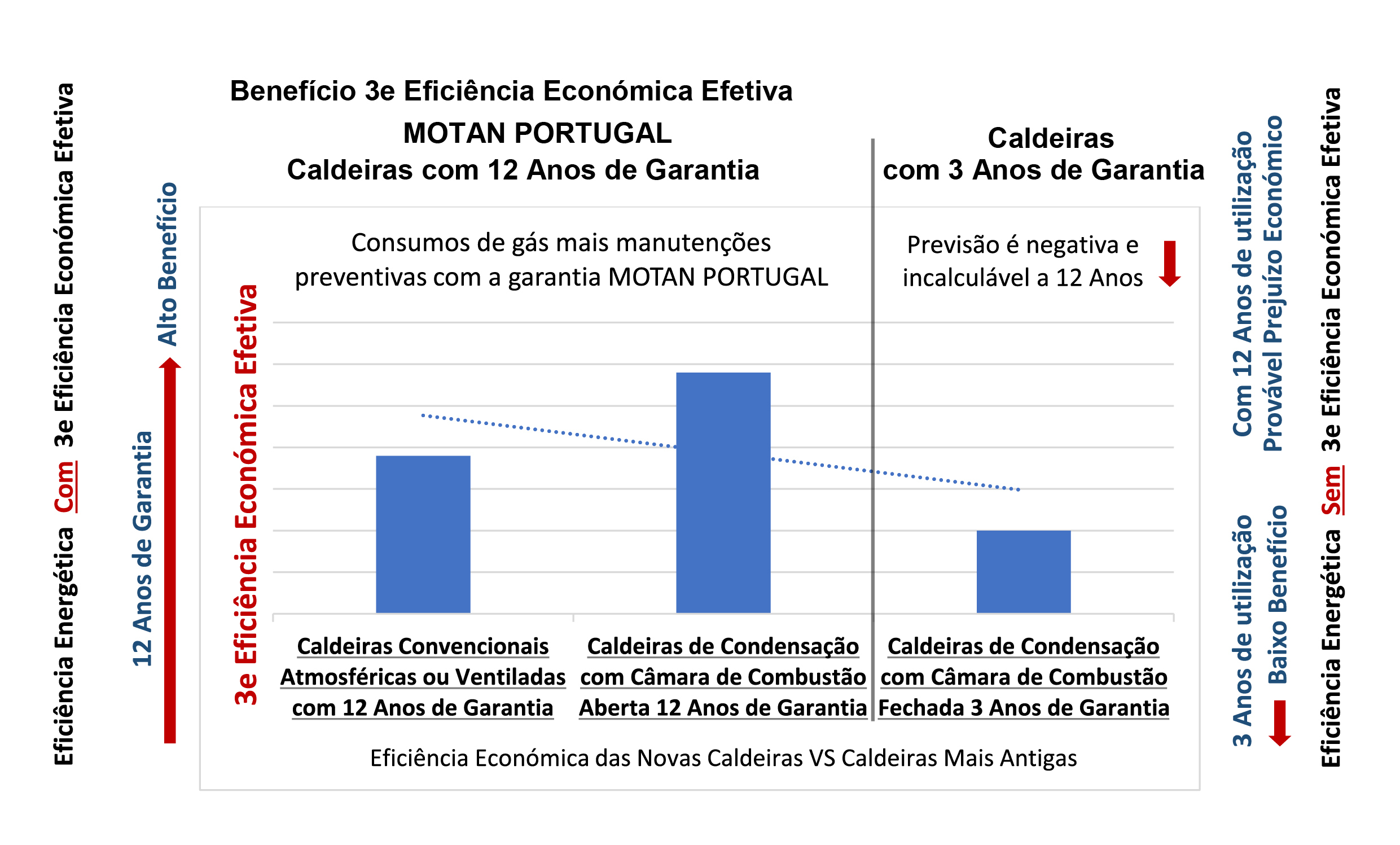 Após um estudo efetuado, verificamos que com uma caldeira de condensação com câmara de combustão fechada o resultado para o cliente final é sempre negativo em mais de 9% versus a aquisição de uma caldeira convencional da classe PREMIUM da MOTAN KÖBER PORTUGAL devido à elevada qualidade dos nossos equipamentos nos permitir oferecer 12 Anos de Total Garantia. São 12 Anos a 0€ em caso de avarias o que não acontece com as caldeiras de condensação com câmara de combustão fechada. São 12 Anos sem a utilização de recursos a inspeções, reparações ou avarias para o bom funcionamento da caldeira convencional. Caldeiras com 3e Save Money é um exclusivo da MOTAN KÖBER PORTUGAL.